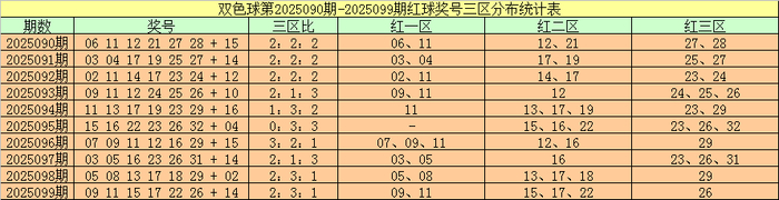 双色球第2025099期奖号为:09 11 15 17 22 26 + 14,红球三区比为2:3:1。