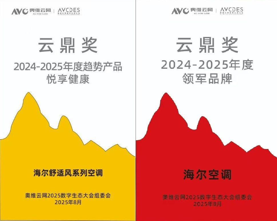 在此背景下,海尔空调凭借在健康、节能、制冷等方面的技术引领,成为7月三强中唯一份额同比正增的品牌,并于近日举办的奥维云网2025数字生态大会上斩获“2024-2025年度趋势产品(悦享健康)”与“2024-2025年度领军品牌”两项云鼎奖。
