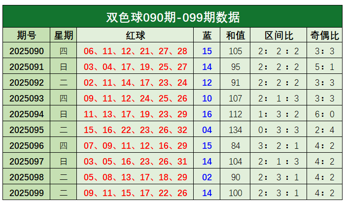 双色球第2025099开奖奖号:红球09、11、15、17、22、26,蓝球14。红球和值为100,区间比为2:3:1,奇偶比为4:2。蓝球开出14。