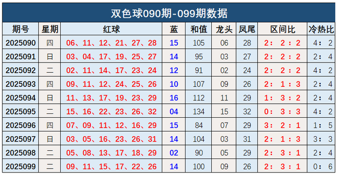 双色球第2025099开奖奖号:红球09、11、15、17、22、26,蓝球14。和值100,龙头09,凤尾26,区间比2:3:1,冷热比0:6。蓝球开出大数号码14。